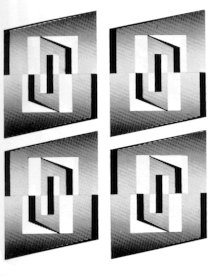 (5) Combined use of symmetry operations Shapes of human footprints and orders of leaves are created by the operation "advancing reflection" which simultaneously uses parallel movement and mirror reflection (The "advancing reflection" is sometimes called "slipping reflection" or "glide reflection" in Mathematics). The shape in the left of Figure 293 will be bilateral symmetry if it is cut vertically at the center and shift slightly as shown in the right of the same figure. In other words, it is known that "advancing reflection" consists of two operation of "translation" (shift) and "mirror reflection". This way, new symmetries can be created by combining "translation", "rotation", "mirror reflection", and "extension". The combination will be 13 in the case of Wolf (Figs. 281-a, b). In summary,