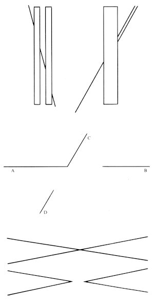 (2) Illusion on shifts in line positions and angles When a straight line and a band are piled up in an acute angle, the straight line is naturally influenced. In this case, the straight line shifts to cause a fault. Then, it makes you feel the shifting line doesn't seem to exist on the extension of the original line (Figs. 311, 312). Similarly curved lines are also influenced by a crossing band. (Figs. 314, 315) Three examples of works using the illustrated illusion