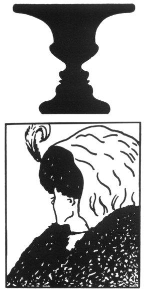 2--Double views There is a famous figure called Rubin's Cup which is related to a problem of "sight" on a shape and its background. In other words, it looks to be either a cup or a person's face depending on whether you pay attention to the shape or its background. It is known that there are many types of these kind of figures when figures which cause reciprocal action like this are investigated. · Depending on whether a shape is seen or its background is seen, figures which have different meanings will appear respectively. This is called "double images". · In this case, the shape of the figure changes, or things which can't be seen appear by changing the point of view. Coexistence of normal and upside-down figures. · Reversal diagram in which a part of it appears to the front or withdrawing backwards by changing a point of view. - Reversal perspective illusion or others. Both of them are reversal diagrams related to the problem of "sight", and modern painters and designers prefer to use them. The technique of the reversal perspective was first