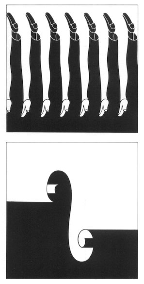 2 -- Others There are various impossible diagrams besides those stated above. There will be significant developments in these fields in the future. New expressions will be created in the field of modeling when a new method to express "sight" is discovered. Moreover, the development of the expressions are strongly demanded because they contain strength and humor. Several examples below will be briefly explained. There are two art works on reversal of a shape and its background. The work in Figure 377 has an equivalent content with that shown on the previous page. In addition, it is also a work which accompanies a reversal action between the shape and its background for sight recognition. Because it is easily understood using short legs, it is desirable to draw legs which are longer than a certain length. The art in Figure 378 is possible if it is seen in part. However, rolling the paper as a whole like this is impossible. A diagram which is composed of two rectangles drawn