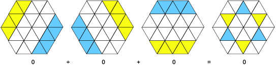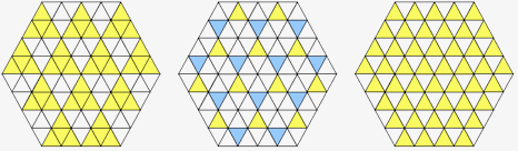 Figure 10: A visual proof of the BW property for a T-hexagon of side 3 The form of the visual proof in Figure 10 suggests a general formula that can hold for any value of n. The first three row combinations to be used are found by counting from the main diagonal in each case. The first row is not used. The second row is used once, the third row is used twice, the fourth row is used three times and so on. This happens in each of the three directions. In general, then, the nth row from the diagonal of a T-hexagon will be used n-1 times, and in each of the three directions. The alternate sector diagram is combined with these three configurations to generate a diagram in which only the triangles that point upwards are selected in yellow. In a formal sense, we can make the inductive hypothesis, Hn, that alternate triangles in a T-hexagon of side n are selected by the composition of three hexagons in which the rows are selected in the manner described together with the alternate sector diagram. We have shown that Hn is true when n = 2, 3 and 4. If we suppose that Hn is true for n = k, then the diagram for the T-hexagon of side k + 1 is formed by increasing the size of the alternate sector diagram and adding a row to each side of the other diagrams that is either a blue row of weight -k or a yellow row of weight k. By assuming that Hk is true, we know that the inside T-hexagon will result in alternating triangles. In the top outer row, all the extra yellow triangles are of weight k, and the blue triangles are of weight k, k, k-1, k, k - 1 and so on, ending with two triangles of weight k. Combining these will result in the required alternating pattern. Hence Hn is true for all n. Implications for Magic Hexagons and Transversals We have shown elsewhere [1] that magic configurations only exist for T-hexagons of side 2n. The proof of the BW property holds for all n, and thus applies in particular to all magic hexagons, in which, therefore, the total of the numbers in the 'black' triangles is the same as the total of the numbers in the 'white' triangles. For magic hexagons, the total in each row was shown to be