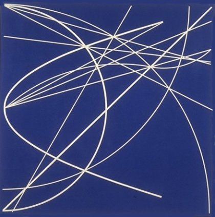 I have taken a historical perspective in my art works to represent and reflect geometries throughout time. Invariably, in this methodology, much of what is integrated into my work has a strong historical foundation in the classical construction methods of the ancient Greek geometers. As I research and integrate into the work, more complex elements of the natural world, such as the structures and color usages, coexist within the realm of these properties. Geometrical mechanics and constructions with color form the fundamental components in the building process of my work. Geometry is thus defined in pictorial space. Someone asked me recently, why I decided to take a geometric approach in my works of art. My answer was that this approach has a clear, universal, and strong foundation, and is therefore readily understood and comprehended. In this vocabulary of nature, from the paths of subatomic particles in cloud chambers and accelerators, to the orbits of the planets, galaxies, and other heavenly bodies, draw relationships to my work. It is without a doubt, correct to say that there is a particular vocabulary constructed from geometric elements that is used consistently throughout my work. Basically, my work consists of color fields, lines (converging, diverging, parallel, or approaching asymptotically), circles, ellipses, hyperbolas, and many of the other classical curves of ancient and modern mathematics. It matters not whether they are considered as conic sections, Euclidean constructions, or the solutions for systems of differential equations. I consider each composition or completed construction, using these elements, as a singular artistic expression. Thus, I use geometry as a language to engineer my aesthetic expressions. There is a strong personal identity and style in my work. In making design choices, there is no uncertainty in the choice of geometrical signing that originate from the vocabulary of geometry. There is a complete union between the aesthetic and the geometric signing. What follows below in the paper, will describe more completely how and why it is that this comes about. I am constantly trying to break new ground by integrating new elements into my work; often the completed work leaves the impression that these solutions were simple or easy. The organization to completion is often enormously awkward and difficult though faced with the need and desire to introduce new and changing elements in my work, I have found that my methods of construction have remained constant. I have devised my own algorithmic constructive procedures to draw the cardioids, tricuspoids, parabolas, strophoids, pseudospheres, and other figures I require in my work. Collinearity, (of a set of points lying in the same straight line) a recurrent theme is never coincidental but is an inevitable outcome, forced in the same way that it occurs in the classical Theorems of projective geometry, such as those of Pascal, Brianchon, Desargues, and others. These mathematicians recognized that spatial situations which produce collinearity were invariably the result of deep underlying geometric truths. The incidence of a point on a line is invariant under the projective rules. If three or more points are collinear along a line, then incident with a straight line, the images will thus be collinear. Therefore, the characteristics of incidence, collinearity, and concurrence are principle requisites of my work. Intersections of lines or curves in my work are occurrences of fundamental importance. A place of intersection where three or more lines meet or cross, is an especially crucial event in my work and forms an integral part of my above mentioned geometric vocabulary. In this system, the perpendicular intersection of two lines is interchangeable with the three- line intersection. It is not the aim to provide a subdivision and dissection of space, but to represent space as a complex unity. Geometrical rules, axioms, methods, and carefully thought out plans enter the world on many levels. The geometrical method lends much to the imaginative and creative faculties of people, and has provided a sustained interest and impetus for me in particular. Many of the elements, straight lines, arcs, elliptical sections, parabolas, hyperbolas, epicycloids, and spirals, accelerate the speed of the viewer's eye through the picture, thus spatial experience is altered in time. Color vibration heightens the speed and expanse for the viewer to complete the picture plane. Within the constraints of geometric mechanics, I have built through the intersection of geometric systems, a way of representing the dynamics of motion, gravitational attraction, flotation, and corpuscular unity. This provides the viewers with visual instruments which they may consider proportionately in relation to themselves and in the image. In this respect, I look to this pictorial vision so that the final result is raised through the perception and understanding of the viewer. An image mathematically abstract in origin and represented as nonobjective in context will change experientially through the picture plane, enabling the viewers’ apperception and organization of mind set. Positive and negative curvature of line, whether all inward or all outward are aesthetic choices combined with reason. It is the idea complex that reaches the positive and negative ranges in the approach. Although the work may seem to have little direct human or emotional content (in the most superficial sense), there are metaphors and connections to the human condition in the various dynamical paths of particles and objects to which we are all subject to. Thus, a hyperbolic trajectory, in the context of Newtonian mechanics, is associated with the freedom and escape from the attraction of a massive and ponderous object. An ellipse or circle, in the same classical Newtonian framework, is the solution which results in stable mutually orbiting systems, as in a marriage, coupling, or a st