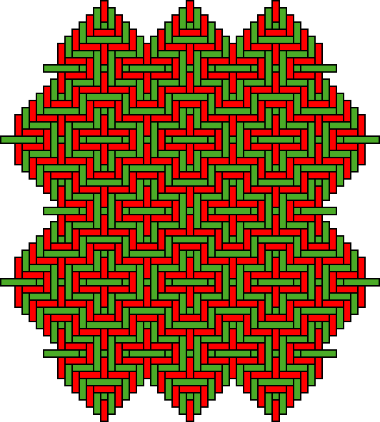 More complex plane patterns Figure 11 presents schematically the plane patterns observed in two níjtyubane (see Photographs 7 and 8). Figures 12 and 13 illustrate parts of the twill-woven patterns. The two plane patterns display different symmetries. They constitute examples of the construction of more complex plane patterns by Bora basket weavers on the basis of simpler units formed by ‘butterflies.’