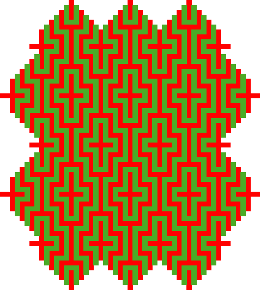 Figure 14 presents the plane pattern formed by the horizontal strings of ‘butterflies’ of the type (1, 2, 3, 5×1) separated by zigzags with the width of three units. Figures 15 and 16 present the two distinct possibilities to transform this pattern of ‘butterfly’ strips, alternating yellow and brown strips in both directions. Figure 17 illustrates the visual impression of the first pattern that corresponds to the níjtyuba presented in Photograph 2.