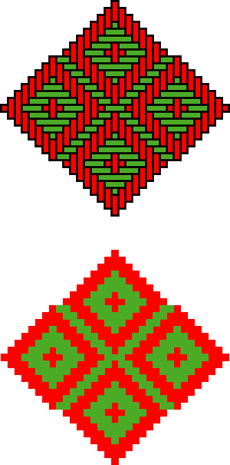 Abstract The paper defines and analyses a class and several subclasses of semi-regular patterns appearing on twill plaited mats and baskets. The patterns are composed of sets of congruent concentric toothed squares that are at different distances in both weaving directions. A comparative overview and examples of their regional distribution are given. In this paper I introduce the concept of semi-regular square plane patterns on twill plaited mats and baskets and present examples from several cultures around the world. Photographs 1 and 2 present two baskets with semi-regular square plane patterns. Many examples come from Bora mat weaver living in the Peruvian Amazon, who seem to have been particularly keen in inventing and using semi-regular square plane patterns. The semi-regular square plane patterns differ from the regular ones in one fundamental aspect. Whereas in the case of the regular ones, the distance between the horizontally neighbour sets of concentric toothed squares is always the same as the distance between the vertically neighbour sets of concentric toothed squares, in the case of the semi-regular square plane patterns this horizontal distance is different from the vertical distance. Figure 1 presents an example of a regular pattern: Both distances are equal to 3. Figure 2 presents an example of a semi-regular pattern: The horizontal distance is 3, whereas the vertical distance is 1. By consequence, semi-regular square plane patterns have only two axes of symmetry. Their two-colour images belong to symmetry class cmm. Were regular square plane patterns on twill plaited mats characterised by a set of four numbers (p,q,r,s), semi-regular square plane patterns may be characterised analogously by (p,q,r,s×t), where s represents the distance between horizontally neighbour sets of concentric toothed squares and t the distance between vertically neigbour sets of concentric toothed squares. In this sense the regular and semi-regular square plane patterns in the example above may be characterised by (1,2,3,3) and (1,2,3, 3×1), respectively. There is no difference between (p,q,r, s×t) and (p,q,r, t×s), as they correspond to the view of opposite sides of the mat rotated about a right angle. In the following I present the classes of semi-regular