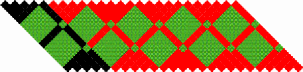 Figure 4 Figure 5 We will call the first dimension the period of the decorative motif and the second dimension its diagonal height. In the given example, we have 4 as the period. In other words, the period indicates how many coloured strands are necessary to generate the decorative motif. For each pattern in the complementary catalogue of gipatsi-patterns we will indicate a generating toothed parallelogram. The gipatsi-patterns will appear in increasing order of their period. Patterns of the same period come in increasing order of their diagonal heights. A gipatsi-pattern will be represented by p×h [n], being p its period, h its diagonal height and n its order among the gipatsi-patterns with dimensions p×h. For instance, the pattern with the code 2×9 [4] refers to the fourth pattern with dimensions 2 by 9. Figure 6 presents the 58 new gipatsi-patterns.