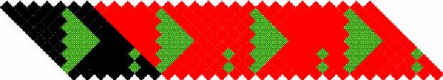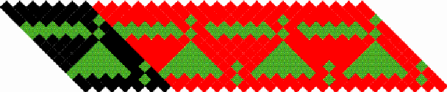 Photograph 1 Photograph 2 Photograph 3 Photograph 4 The Tonga weavers are also very creative in inventing new strip patterns. Whereas the catalogue in (Gerdes & Bulafo 1994) included 96 different strip patterns (collected in the period 1977-1993), the catalogue in (Gerdes 2003) includes 362 different strip patterns collected until July 2002. This paper presents 58 new strip patterns that appear on sipatsi collected between August and December 31, 2002. Representation of strip patterns Figure 1 illustrates part of a gipatsi. In the illustration, the darker strands, in fact, are purple, dark green, or, dark blue (see the photographs). The use of different colours makes sipatsi more attractive. For the weavers of sipatsi, the beauty of the ornaments resides principally in the quality of the contrast generated by the plaiting of sets of strands of natural colour ("white-yellow" strands) with coloured strands. For this reason, we may represent all coloured strands with the same colour.