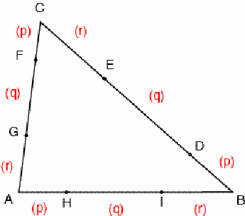 Figure 1 Consider an arbitrary triangle ABC. Let D and E be points on the side BC, F and G points on CA and H and I points on AB, such that BD : DE : EC = CF : FG : GA = AH : HI : IB = p : q : r with p+q+r=1, being p, q and r positive numbers (Figure 1). The areas of the corner triangles AHG, BDI and CFE are equal to pr times that of ABC. The areas of the triangles FGH, HID and DEF are equal to pq times that of ABC. Furthermore, the areas of the triangles GHI, IDE and EFG are equal to qr times that of ABC. In Figure 2 the triangles that have equal areas are represented by the same colour.