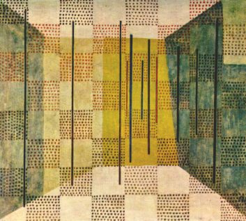 One of the most enigmatic spatial compositions of Klee’s is the painting Chess (1931; see Fig. 1). Let us start with a general description of its three main elements. First, we have a set of vertical coloured bars (black-brown, red and blue). They are displaced in the space in such a way to suggest a sense of perspective depth. Indeed, as we shall see, their perspective construction is perfect, even though we have the sensation that the bars are randomly spread into the space. In the background an architectonic element is depicted, something like the interior of a building, a room, just suggested with its greenish-yellow bare walls, floor and ceiling, and with a light-coloured rectangle in the up-right corner of the painting as a little window. The background too seems to suggest the idea of perspective depth, but there is something disturbing or even wrong, that we almost immediately perceive, which confers to the composition a diffuse sense of instability. Furthermore the location of the bars with respect to the room is quite problematic, because it is difficult to match the slightly different perspective suggested by the two elements; particularly, it is difficult to understand if the bar system were depicted inside or outside the room. The third important element in the composition is the checkerboard, depicted by means of arrays of red-brown points, forming a grid of little transparent squared cells; the checkerboard looks like the fourth (transparent) wall of the room (near the external observer), which closes the perspective box as a cover. With reference to this hypothetical wall, it is even more difficult to decide if the bars are placed inside or outside, even because Klee carefully avoided to paint any point on the coloured bars (which would be the definitive evidence that the bars were inside). Thus at a first glance the checkerboard makes us think of a chess problem, something puzzling, which indeed holds a perfect corrispondence with the enigmatic ambiguity of the depicted space. |