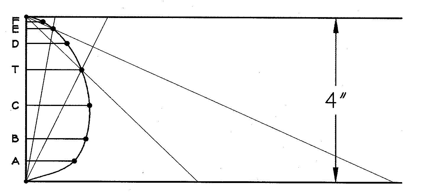 Figure 3: Figures 1 and 2 combined to create the bud shape as a path curve. Now suppose that, instead of having multiplier l 1 on a and multiplier l 2 on c we had multipliers of l 11/2 on a and l 21/2 on c. Then two steps of this "walk" are equivalent to one of the original. All of the "footprints" of x on the first walk remain footprints on the second, but the second has an extra point between each pair of the first. If we took a walk with l 11/3 on a and l 21/3 on c, then c would make two footprints between each pair of the original ones. With l 12/3 and l 22/3, x would have every other one of these footprints. Clearly c is traversing the same "path" on all of the walks; only its step-length differs. For all of the step-lengths, the ratio l = log l 2 /log l 1 = log Öl 2 /log Öl 1 remains the same and characterizes the path itself. Note that the exponential ratio is denoted by the unsubscripted symbol lambda (l ). At half-inch intervals along the vertical axis of the enlarged bud, Edwards measures the diameter. These measurements on at least seven buds of the species are averaged and plotted, as in Figure 4, to obtain one data point. Edwards then takes two points on the profile, say T and E in Figure 4, draws lines from O and V through them, and computes the multipliers l 1 and l 2 on lines a and c respectively. He then calculates