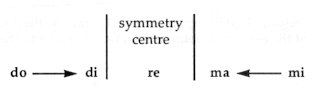 The notes of the acoustic scale are also symmetrically arranged – around the RE symmetry-axis (the mirror-image of FI being TA). (See: Fig. 214 on p. 110) Degree RE constitutes the symmetry center not only of the pentatonic scale, but of the major and minor scales as well (where upwards and downwards from the RE, each interval has its exact mirror image):