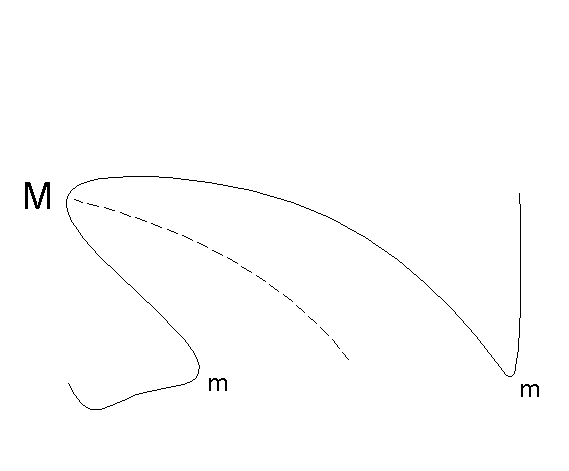 Symmetry-Curvature Duality The Free-Form Grammar relies on two structural factors in a shape: symmetry and curvature. Mathematically, symmetry and curvature are two very different descriptors of shape. However, a theorem that I proposed and proved in Leyton (1987b) shows that there is an intimate relationship between these two descriptors. This relationship will be the basis of the entire paper: SYMMETRY-CURVATURE DUALITY THEOREM (Leyton, 1987b): Any section of curve, that has one and only one curvature extremum, has one and only one symmetry axis. This axis is forced to terminate at the extremum itself. To illustrate: Consider the shape shown in the following figure. The section of curve between the two letters m, has only one curvature extremum - that indicated by the letter M. The theorem says that this section of curve can have only one symmetry axis, and that the axis is forced to terminate at the extremum. ![]()