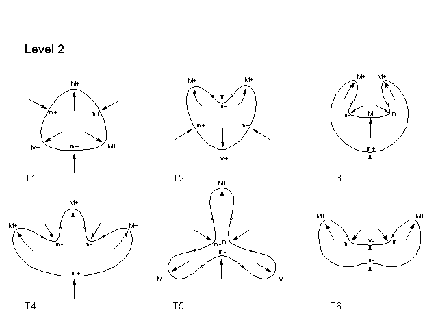 Corroborating Examples To see that our two rules consistently yield satisfying process-explanations, let us obtain the processes that these rules give for a large set of shapes. We shall take the set of all possible shapes that have 8 extrema or less. Such shapes fall into three levels: shapes with 4 extrema, shapes with 6 extrema, and shapes with 8 extrema. The reason is that, there cannot be shapes with an odd number of extrema - because maxima have to alternate with minima of curvature - and there cannot be shapes with less than 4 extrema by a theorem in differential geometry. We will refer to the three successive levels of shapes as Levels 1, 2, and 3 respectively. There are a total of 21 shapes, of succesively increasing complexity. Since it takes a while for the internet to mount these shapes, lets make our comments first: (1) When the shapes appear, the reader will notice that, on each shape, each extremum is marked by one of four symbols: M+, M-, m+, m-. This is because there are mathematically four kinds of curvature extrema: Positive Maxima (M+); Negative Maxima (M-), Positive minima (m+); and Negative minima (m-). (2) When one surveys the shapes, one finds that there is the following simple rule that relates the type of extremum to an English word for a process: SEMANTIC INTERPRETATION RULE M+ is always a protrusion