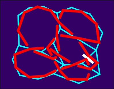 For their construction in some polyomino (polyiamond or polyhexe), we propose the following method. First, we construct all the different curves in it without using internal mirrors, starting from different cell-edge midpoints and ending in them, till the polyomino is exhausted, i.e. uniformly covered by k curves. After that, we may use "curve surgery" in order to obtain a single curve, according to the following rules: ![]() In every polyomino we may introduce k-1, k, k+1,..., 2A-P/2 internal two-sided mirrors, where A is the area and P is the perimeter of the polyomino. Introducing the minimal number of mirrors k-1, we first obtain a single curve, and in the next steps we try to preserve that result. In the case of a rectangular square grid RG[a,b] with the sides a, b, the initial number of curves, obtained without using internal mirrors is k = gcd(a,b) (greatest common divisor), so in order to obtain a single curve, the possible number of internal two-sided mirrors is k-1, k,..., 2ab-a-b. According to the rules for introduction of internal mirrors, we propose the following algorithm for the production of monolinear designs: in every step, each of the first internal k-1 mirrors must be introduced in crossing points belonging to different curves. After that, when the curves are connected and transformed into a single line, we may introduce other mirrors, taking care about the number of curves, according to the rules mentioned. For example: