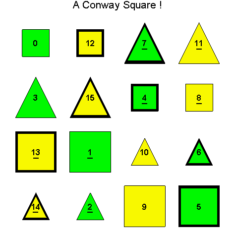 Exercise 3.15. Using your results in Exercise 3.14 verify the number of essentially different Conway squares of each type found in Corollaries 2.9 and 2.13. Here is a helpful MapleÔ worksheet [insert link].