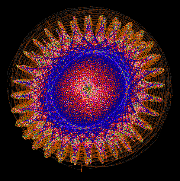 Rules: P1: P1(angle) = P1(angle) + P1(angular increment) P1(x) = P4(x) + P1(radius) * P1(cos(angle)) P1(y) = P4(y) + P1(radius) * P1(sin(angle)) P2: P2(angle) = P2(angle) + P2(angular increment) P2(x) = P3(x) + P2(radius) * P2(cos(angle)) P2(y) = P3(y) + P2(radius) * P2(sin(angle)) P3: if P3(radius) < 0 or P3(max radius) > 120, then set P3(radius increment) to P3(radius increment) * (-1) end if P3(radius) = P3(radius) + P3(radius increment) P3(angle) = P3(angle) + P3(angular increment) P3(x) = P0(x) + P3(radius) * P3(cos(angle)) P3(y) = P0(y) + P3(radius) * P3(sin(angle)) P4: P4(angle) = P4(angle) + P4(angular increment) P4(x) = P3(x) + P4(radius) * P4(cos(angle)) P4(y) = P3(y) + P4(radius) * P4(sin(angle)) P5: d1 = distance(P1, P5) d2 = distance(P2, P5) if d1 is less than or equal to 8 and d2 is less than or equal to 8, then if P5 is pursuing P1, then let P5 pursue P2 else if P5 is pursuing P2, then let P5 pursue P1 end if end if